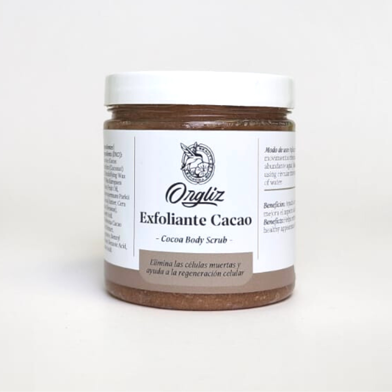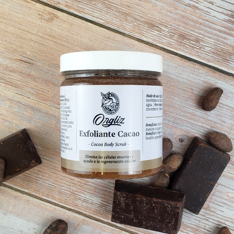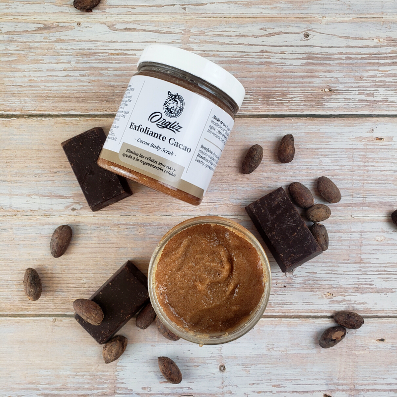 Exfoliante físico o mecánico compuesto por activos vegetales que mediante un proceso de fricción remueven las células muertas, acelerando el proceso de descamación, lo que te mejora la apariencia de nuestra piel, permite lucir una piel limpia, hidratada, suave y ayuda a la regeneración celular. El cacao es Rico en vitamina E, que mejora la elasticidad de tu piel.